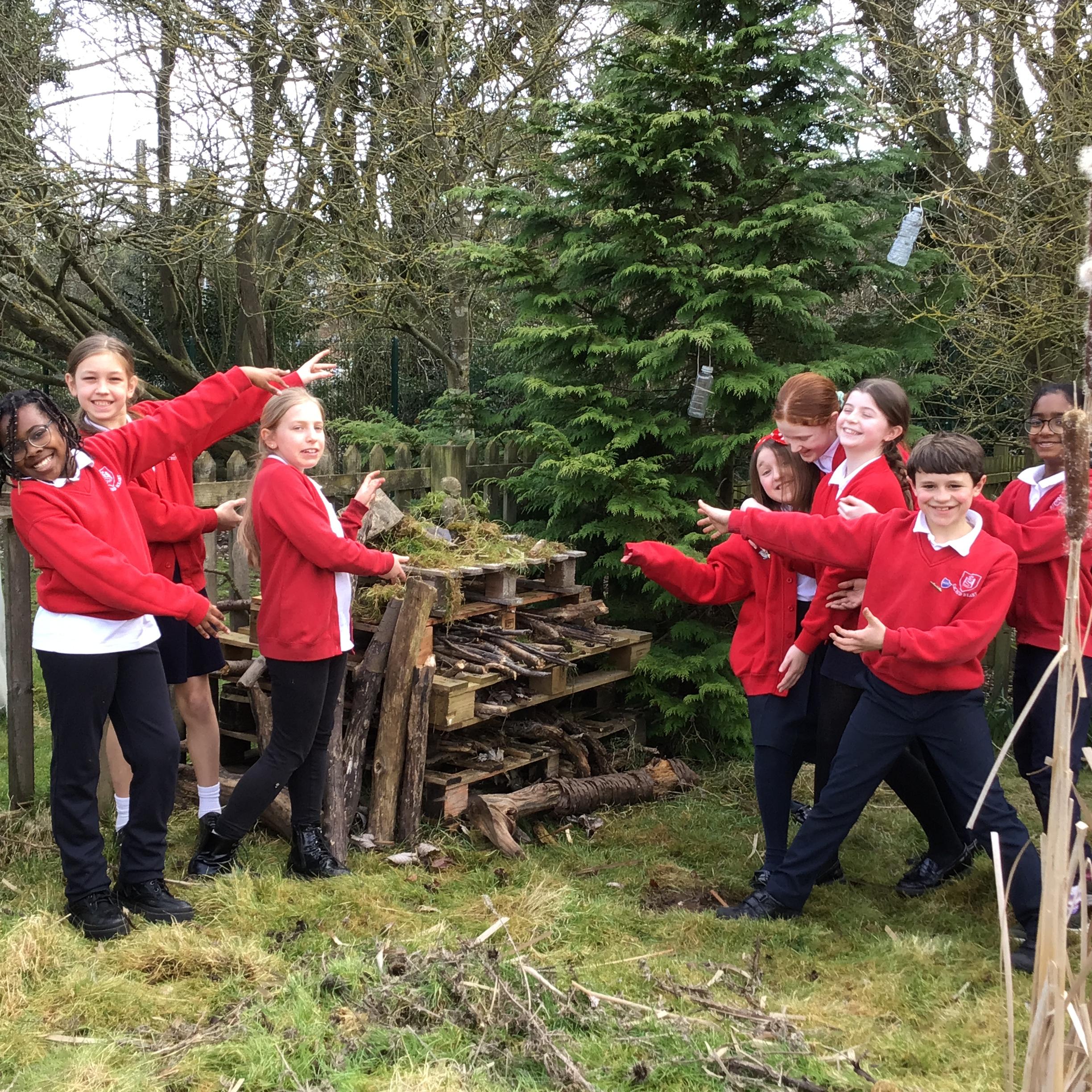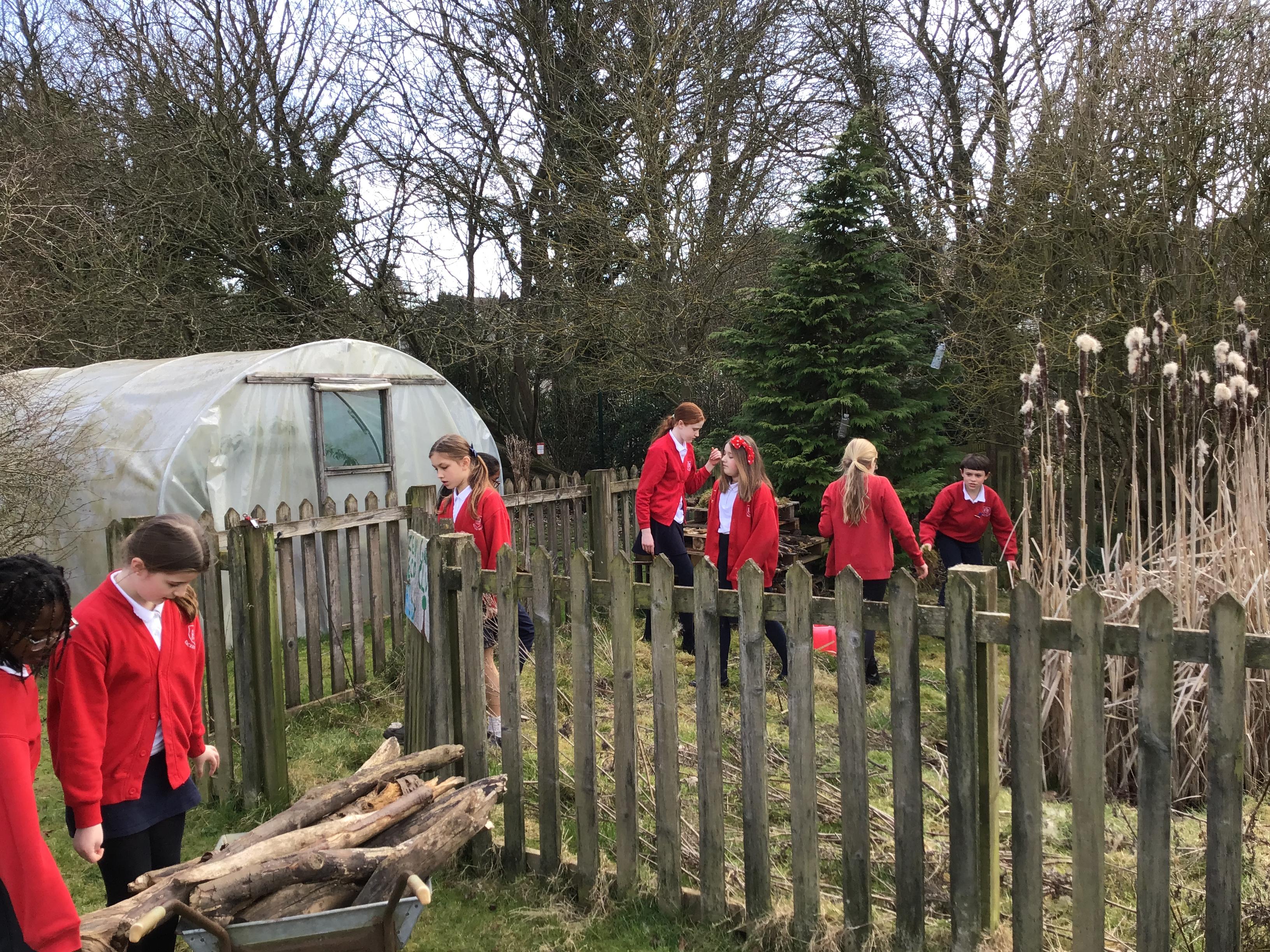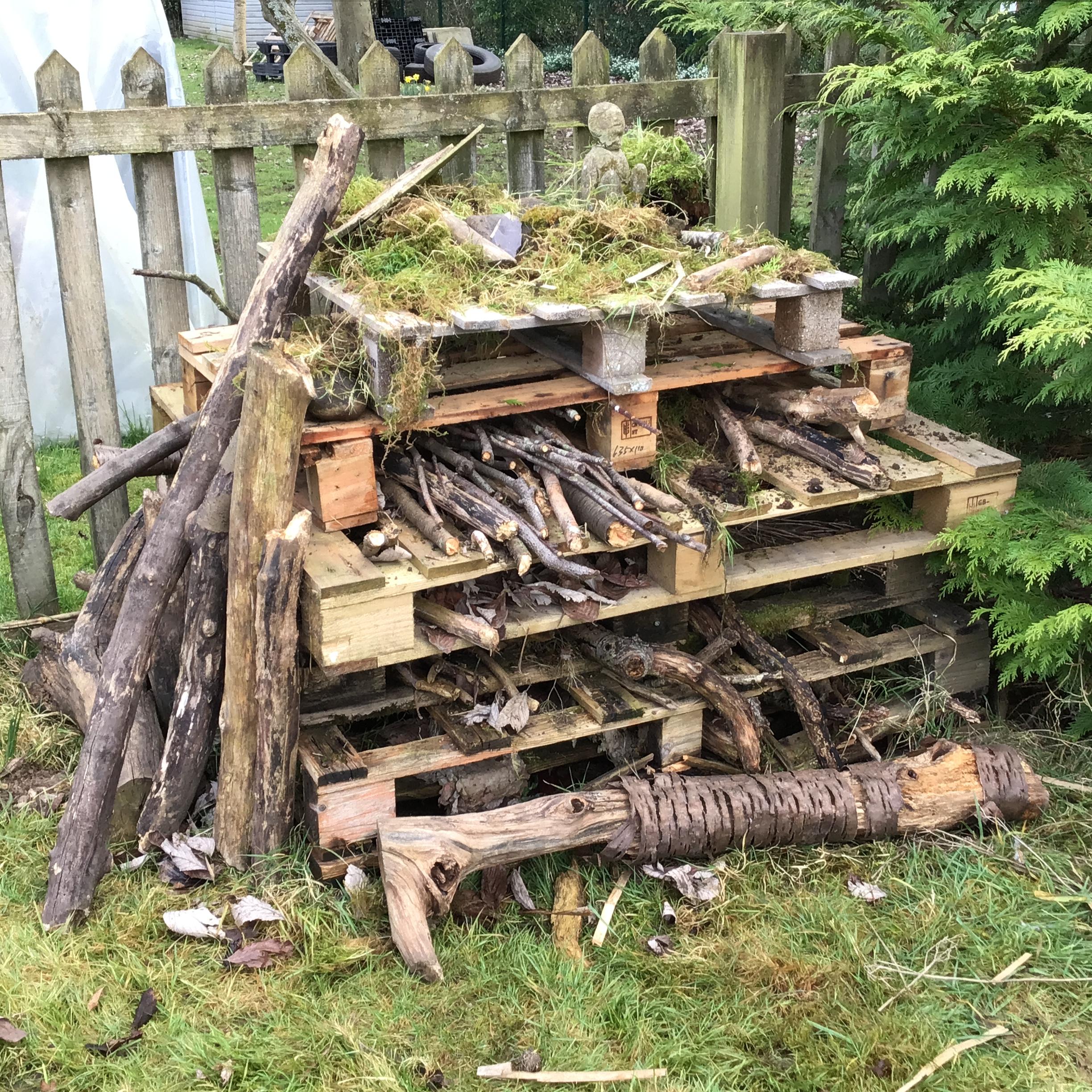 Next we used our expert building skills to repair our bug hotel. In addition to supporting pollinators, bug hotels encourage biodiversity by attracting a range of beneficial insects. Insects like ladybugs, butterflies, and predatory beetles are all drawn to these structures, helping to create a more diverse and balanced ecosystem. A perfect addition to our ever-improving pond area.